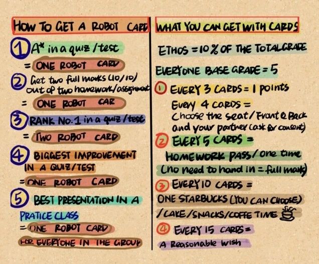 这些可爱的小卡片是用于课堂教学、考试以及课后作业中评估学生的成绩和态度的奖励。例如,考试中获取A*的同学、较上一次考试进步很大的同学、作业成绩持续优异的同学都可以拿到卡片,学生们积攒的卡片可以换取各种各样的奖励。希望这个方法可以让学生们更加热爱数学。
