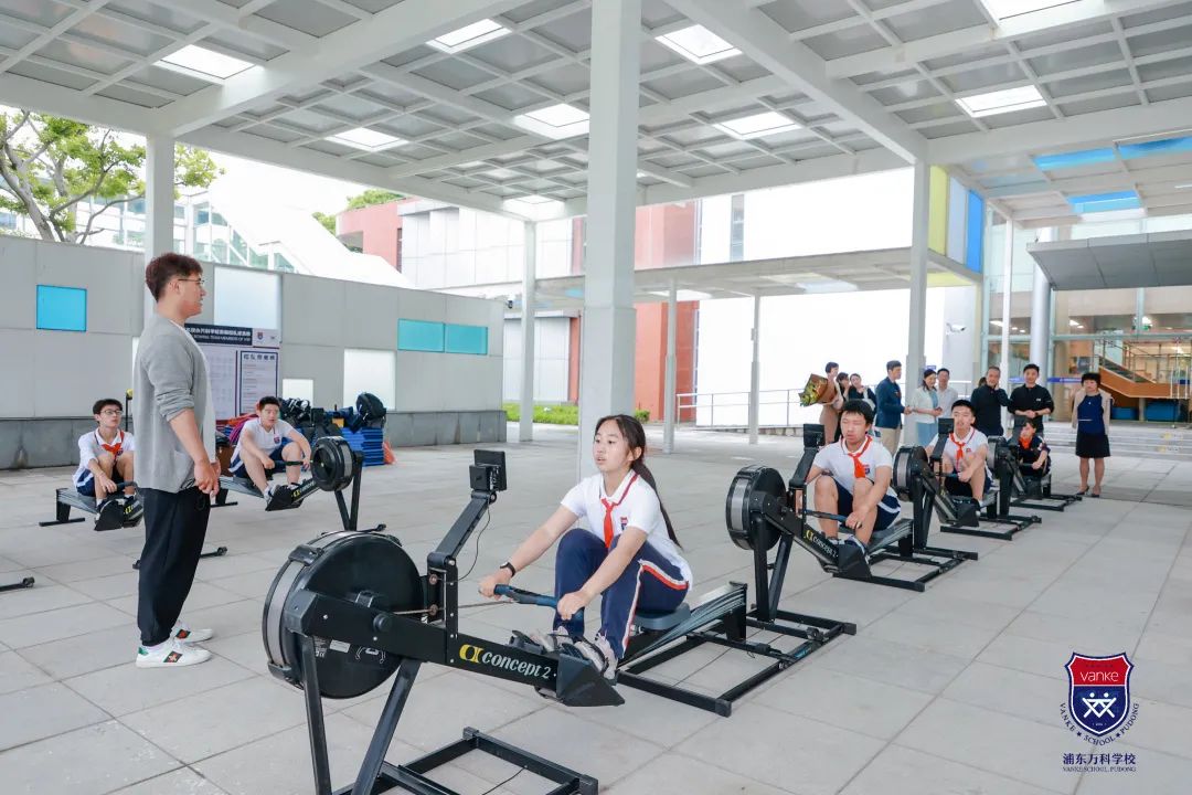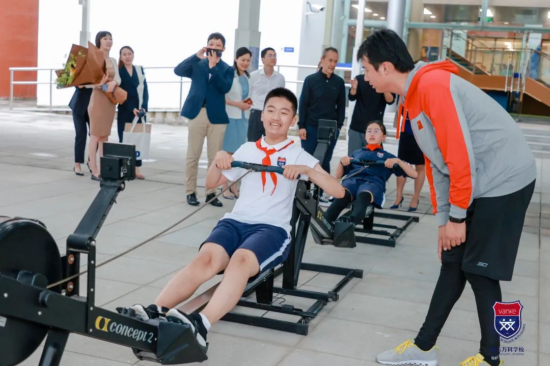 据孙校长介绍,小学部的孩子们除了必修的攀岩课外,还有棒球课等丰富的体育课程设置。而初中开始,赛艇则被加入体育课,作为必修。王石主席路过教学楼前看到孩子们正在利用划船机进行模拟训练,饶有兴致地停下来观看。孩子们也没有因为主席的到来打断自己的训练计划,一边在有条不紊地利用划船机模拟训练,另一边正以小组形式在锻炼团队配合能力以及平衡能力。