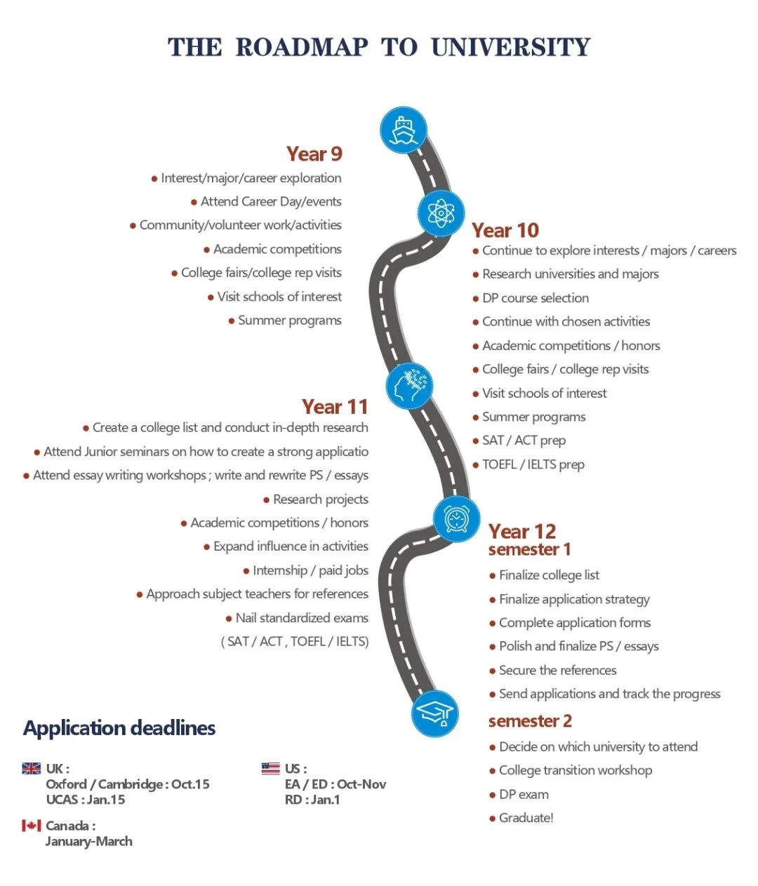 学校升学指导办公室为IBDP学生提供生涯规划和升学指导课程,由有经验的资深升学指导顾问全程指导学生,包括如何自我认知,如何合理选课,以及最终阶段如何根据IB成绩进行大学申请。