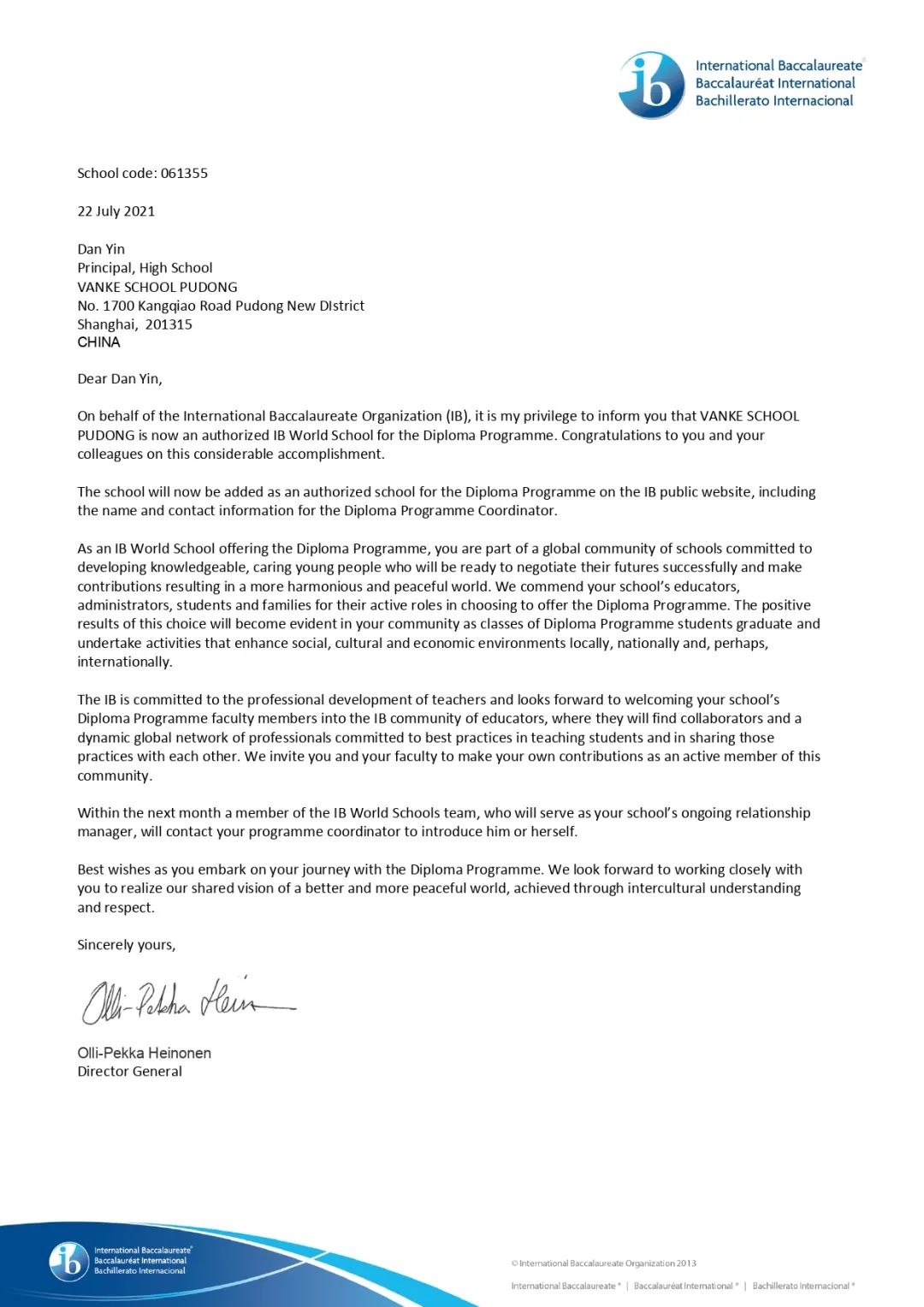 2021年7月22日,上海浦东新区民办万科学校获得国际文凭组织(IBO)大学预科项目(IBDP)官方认证授权(授权代码:061355),正式成为IB世界学校。