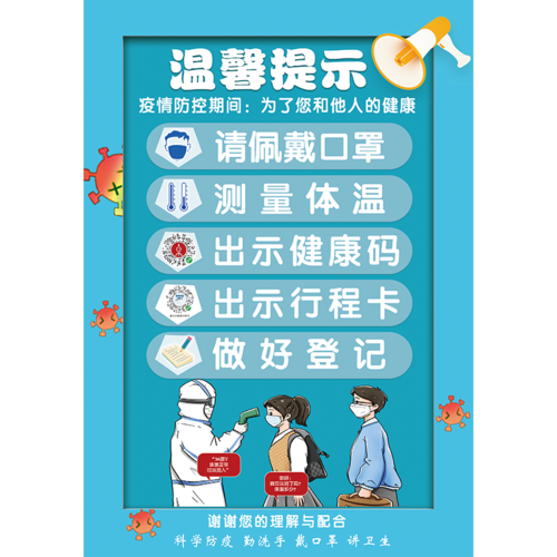 1. 自觉遵守防疫措施,外出配合戴口罩,测量体温,出示健康码,行程卡等。