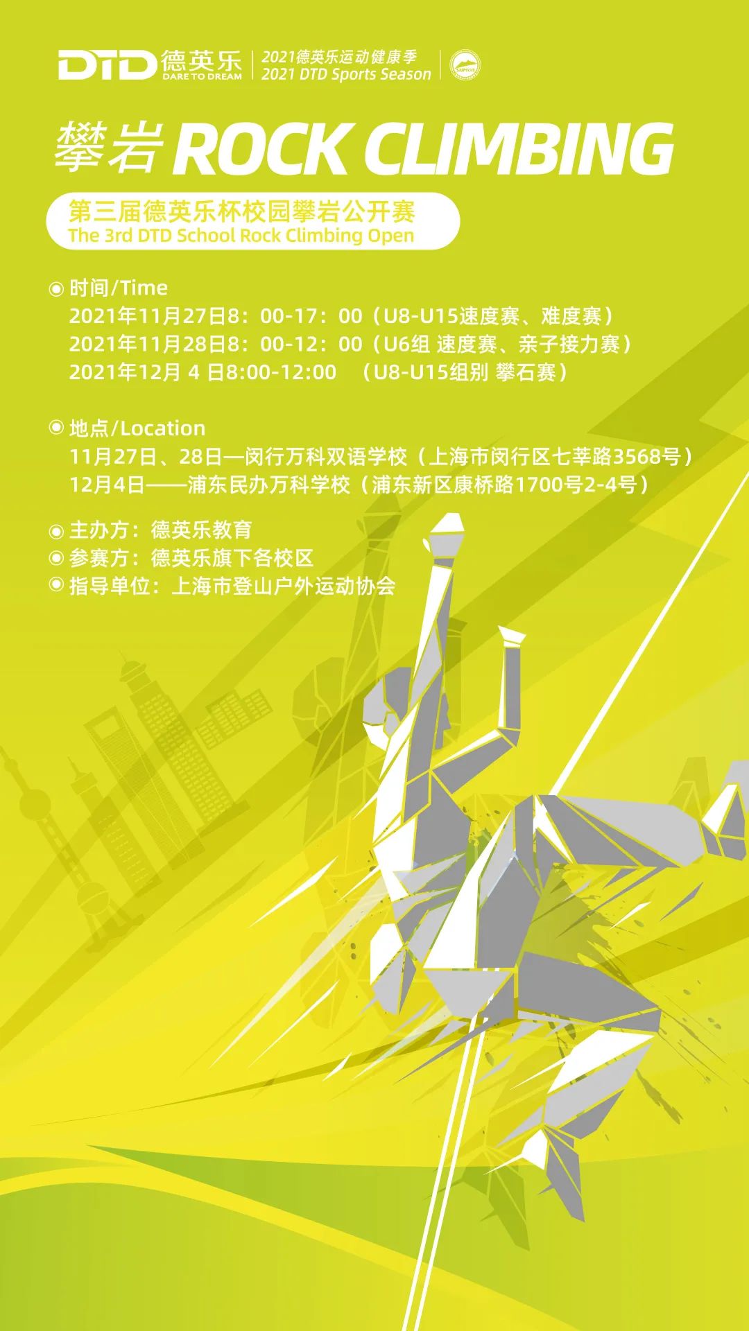 2021第三届德英乐杯校园攀岩公开赛在即日起开启报名!本次攀岩公开赛涉及年龄组别多,开设了多种竞赛项目 – 速度赛,难度赛,亲子速度接力赛,攀石赛,团体赛等等。让孩子和家长们都可以体验攀岩的魅力,点击“阅读原文”或扫描下方二维码,即可报名!