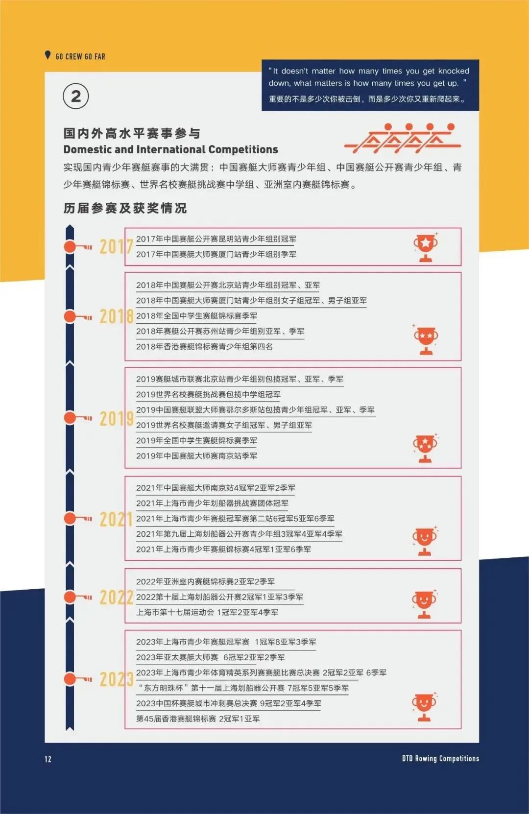 作为国内青少年赛艇强队,德英乐赛艇队成立于2016年,是全国最早的一批民间青少年赛艇组织之一,成绩在国内始终处于佼佼者,实现了国内青少年赛艇赛事的大满贯。