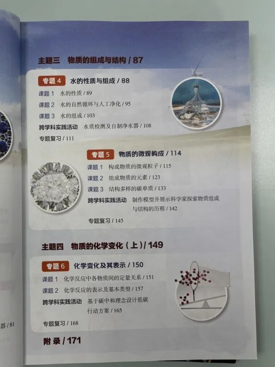 另外新教材增加了大量实验设计等章节,可以看出未来也会非常重实验,每个专题都有一个跨学科实验活动。新教材要求不是学什么考什么,而是要你知其所以然并举一反三。比如学会了教材内的水的净化的原理,会让同学们自制净水器。