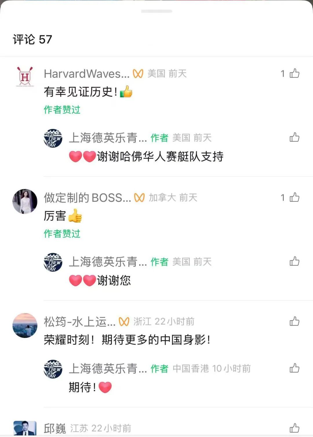 包括哈佛华人赛艇队在内向少年们发来祝贺