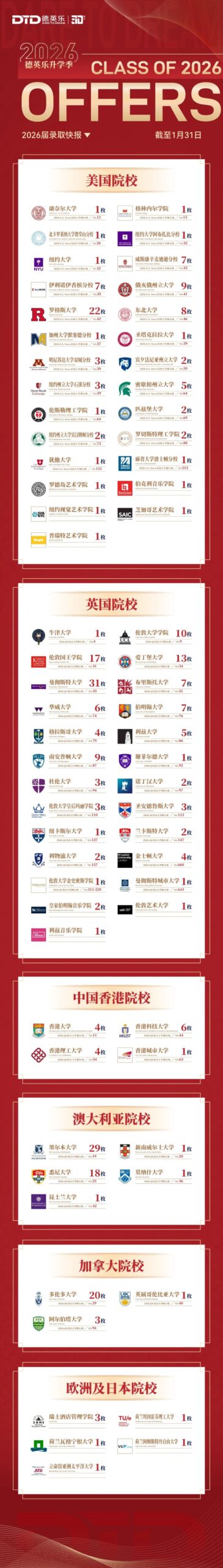 我校学子Ethan Dai首度叩开常春藤盟校大门,成功斩获康奈尔大学录取。这名初中直升学子的卓越成长,是德英乐一贯制培养路径的生动印证。除此之外,美国方向的录取地图呈现出丰富的维度:在顶尖文理学院(如格林内尔学院)与综合性大学(如北卡罗莱纳大学教堂分校1枚、纽约大学2枚、威斯康辛麦迪逊分校7枚、俄亥俄州立大学9枚、罗格斯大学22枚、东北大学2枚等)的学术赛道上,我们收获颇丰;在顶尖艺术领域,收获了罗德岛艺术学院芝加哥艺术学院普瑞特艺术学院等录取;在专业音乐领域,世界闻名的伯克利音乐学院也抛来了橄榄枝。这充分印证了“激发无限潜能”并非单一赛道,而是支持每个梦想发光的土壤。